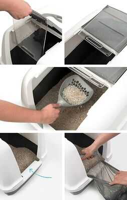 Kapağı çıkarılabildiği için temizlenmesi kolaydır. Klipslerini açtıktan sonra kapağını çıkartınız. Değiştirmek istediğiniz kedi kumunu rahatça atmanızı sağlayacak bir torba askılığı da vardır.